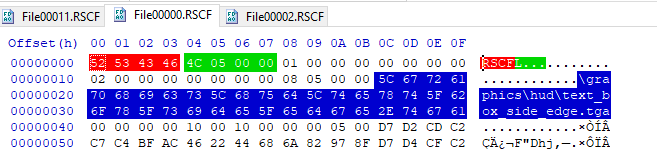 I'm trying to rip some textures from the game but I simply can't decrypt the aforementioned format. I've tried to figure out what information was stored in the header but I couldn't find much. The files start with the usual "RSCF" string, followed by 4 bytes for the file's size (including the header's size). I don't know what the 20 next bytes (08 to 1B) are meant to be. Then comes a string for the file's path with a filename usually ending in *.tga. I've tried to get rid of the header and then import the file into photoshop as a tga file but it didn't work. I'm not familiar with tga files at all so I don't know what to do. Can someone help me?
